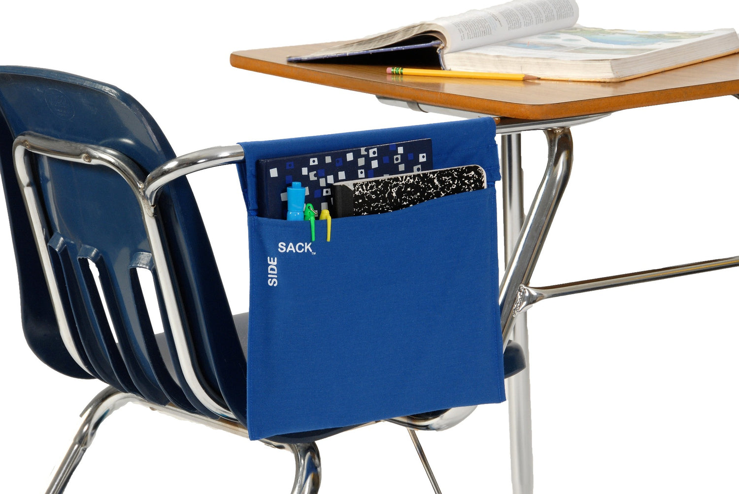 The Seat Sack Side Sack is a hanging desk storage pocket designed to instantly add accessible storage to tablet arm desks where traditional storage is limited. Its interlocking system and hook and loop closure allow the Side Sack to securely attach to the side arm of a desk, creating convenient space to hold books, tablets, school supplies, notebooks, and other essential materials right at a student’s seat. The roomy storage pocket helps keep learning materials organized and off the floor, making it easier for students to focus and teachers to manage classroom resources.