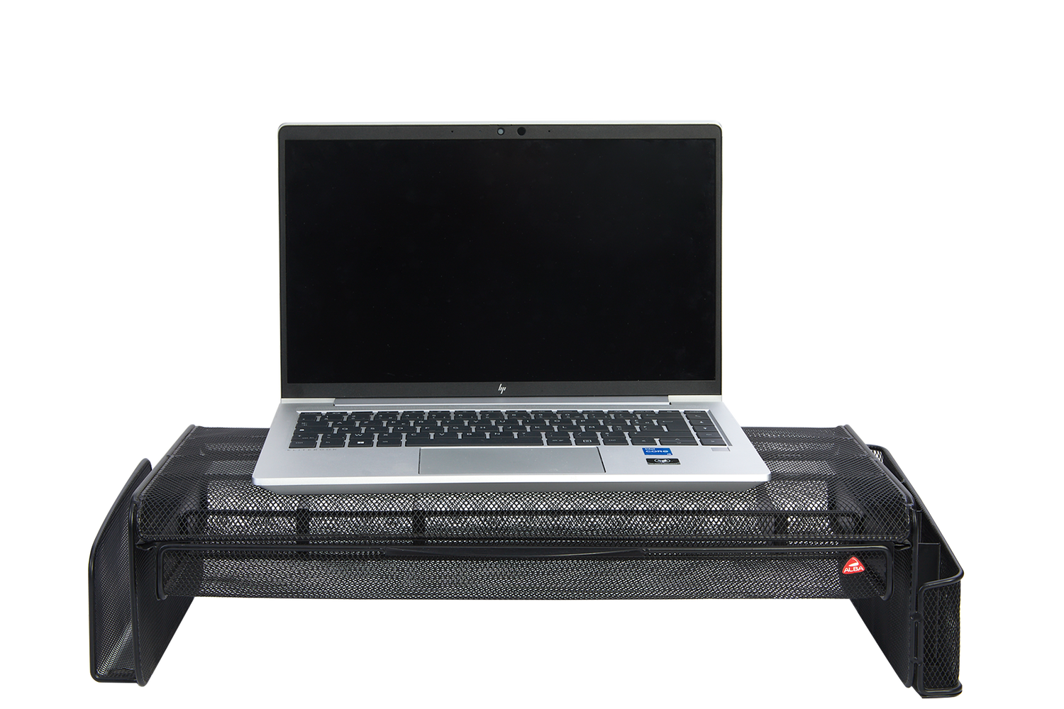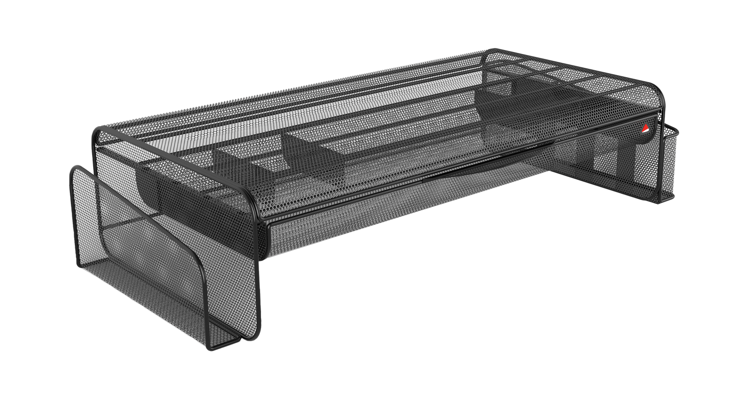 Built from durable black metal mesh with a sturdy MDF frame and aluminum feet with integrated silicone pads, this stand offers excellent stability while protecting desk surfaces. Its smart design includes three integrated storage areas: an open compartment for files, a pencil and accessory organizer with dividers, and a compartmentalized drawer for small office supplies.