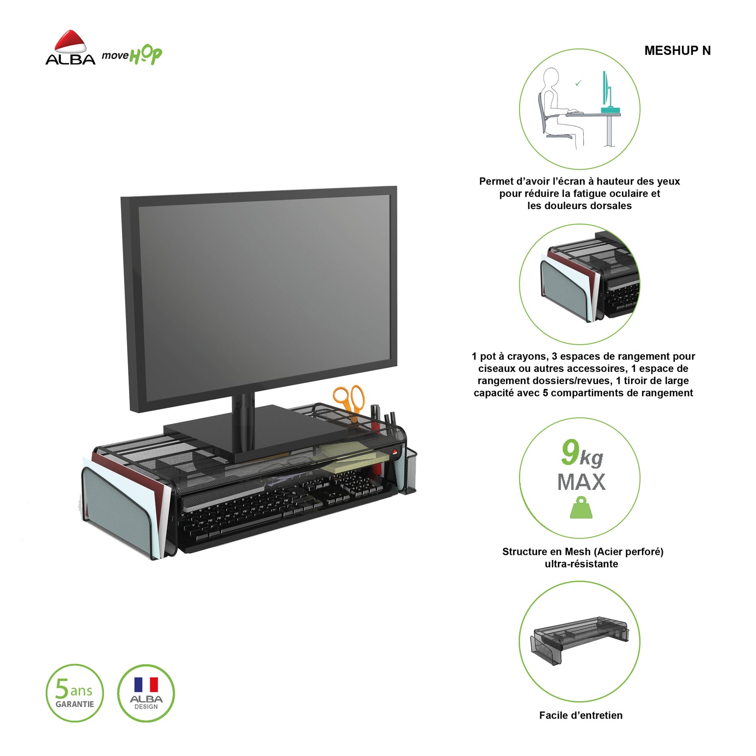 By elevating your screen to eye level, the MESHUP N helps reduce neck and back discomfort while creating a more comfortable and efficient working position. Beneath the platform, dedicated space allows you to store a keyboard and mouse, keeping your desk surface clear and uncluttered.